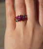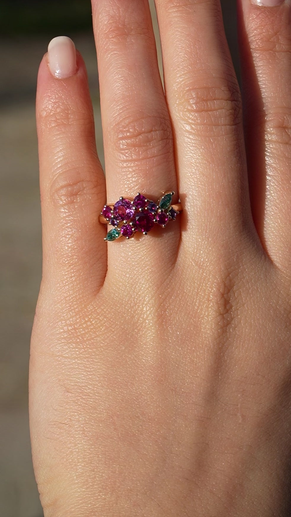 Crafted in solid gold, this elegant piece features stunning pink sapphires at its centre, symbolizing the beauty of a blooming rose. Surrounding the sapphire are delicate green moissanite leaves, adding a touch of nature's charm. Perfect for those who appreciate the blend of romance and nature in a timeless design.
