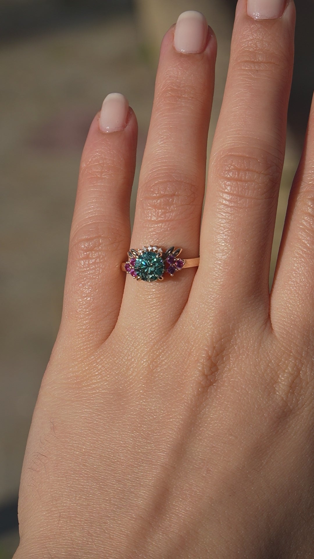 This exquisite ring features a stunning round-cut green moissanite centre stone, flanked by vibrant pink lab sapphire side stones. A crown of sparkling lab diamonds adds brilliance, while gold leaves on the sides bring a touch of nature's elegance.