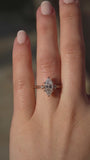 Introducing the Willow ring, a nature-inspired masterpiece that embodies elegance and organic beauty. This exquisite design features delicate gold leaves gracefully wrapping around the band, symbolizing growth and renewal. At its centre, a stunning marquise-cut stone captures the eye, flanked by two radiant round side stones that add a touch of sparkle.
